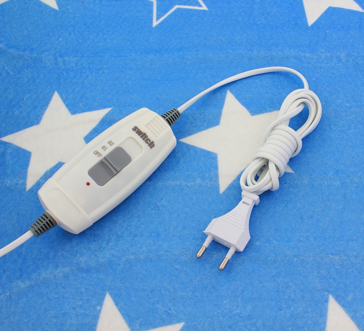 - Přikrývka se připojuje k elektrické síti pomocí přívodního kabelu o délce přibližně 2 metry. Na kabelu je regulátor teploty, který umožňuje výběr jednoho ze 2 úrovní ohřevu.